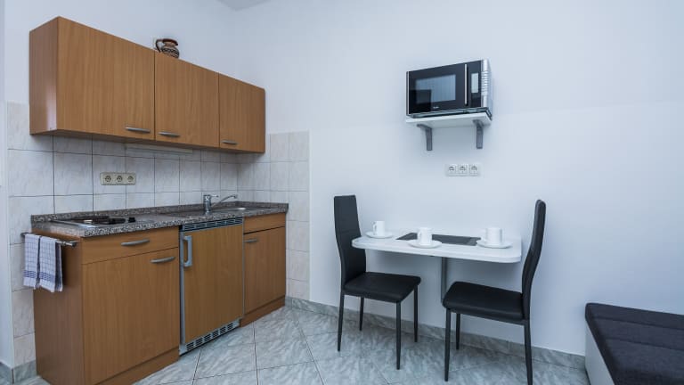 Die Apartments verfügen über eine voll ausgestattete Küchenzeile, die es Gästen ermöglicht, eigene Mahlzeiten zuzubereiten. Zu den Annehmlichkeiten gehören Kühlschrank, Mikrowelle, Herdplatte sowie Kaffeemaschine und Wasserkocher. Es sind keine spezifischen Informationen zu Verpflegungsoptionen in der Unterkunft vorhanden.