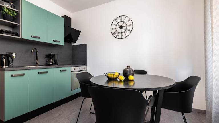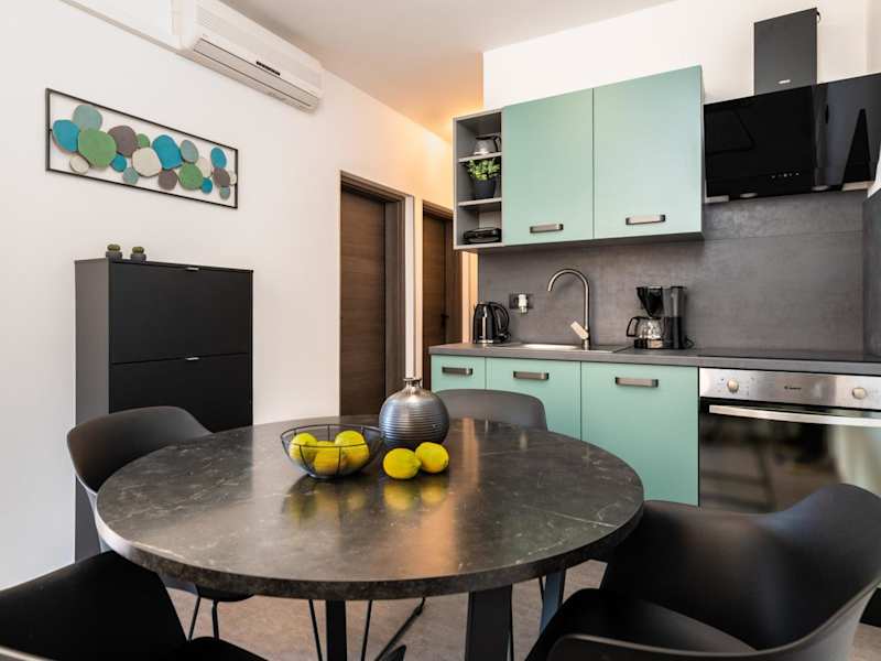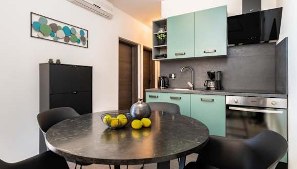Die voll ausgestattete Küche in den Apartments ermöglicht eine selbstständige Verpflegung. Dazu gehören ein Kühlschrank, ein Geschirrspüler, eine Mikrowelle und eine Kaffeemaschine. Die Gäste können ihre Mahlzeiten auf der Terrasse einnehmen und von den Grillmöglichkeiten Gebrauch machen.