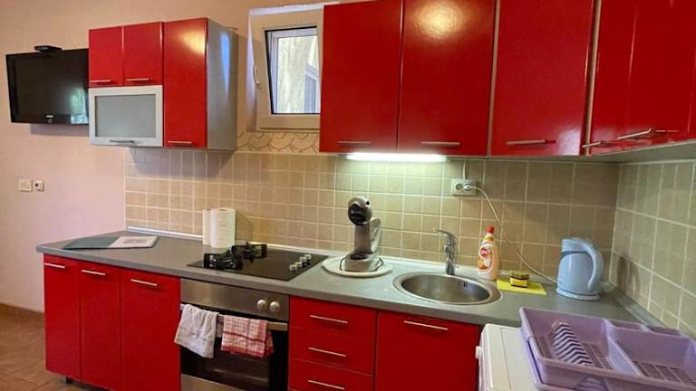Die Apartments beinhalten eine voll ausgestattete Küche mit Kühlschrank, Wasserkocher und Herdplatte, wodurch Gäste die Möglichkeit haben, eigene Mahlzeiten zuzubereiten. Ein Grill ist ebenfalls vor Ort verfügbar.