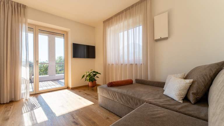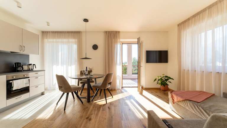 Die Unterkunft bietet helle und heimelige Apartments mit Terrasse und Bergblick. Jedes Apartment verfügt über einen Sitzbereich, einen Flachbild-TV sowie eine voll ausgestattete Küche, die mit einem Kühlschrank, einem Geschirrspüler, einem Ofen, einer Herdplatte, einem Toaster, einer Kaffeemaschine und einem Wasserkocher ausgestattet ist. Das eigene Badezimmer ist mit einer Dusche und einem Haartrockner ausgestattet.