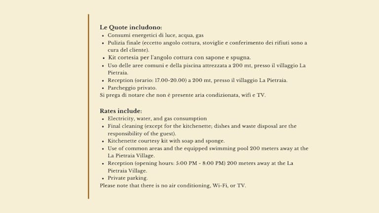 Alle Wohneinheiten verfügen über eine Veranda oder einen Patio sowie eine Küchenzeile mit Kühlschrank und Mikrowelle. Jedes Apartment besitzt ein eigenes Badezimmer mit Bidet. Auf Anfrage können Handtücher und Bettwäsche gegen Aufpreis zur Verfügung gestellt werden.