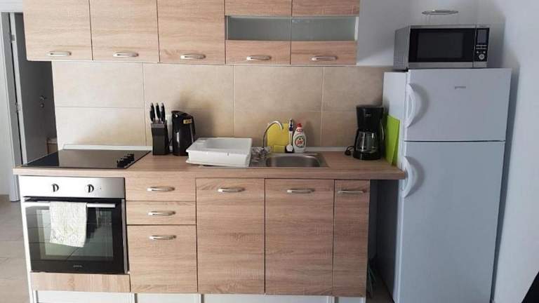 Die Apartments umfassen eine voll ausgestattete Küche mit Kühlschrank und Ofen, jedoch sind keine spezifischen Informationen zu Verpflegungsmöglichkeiten vorhanden.