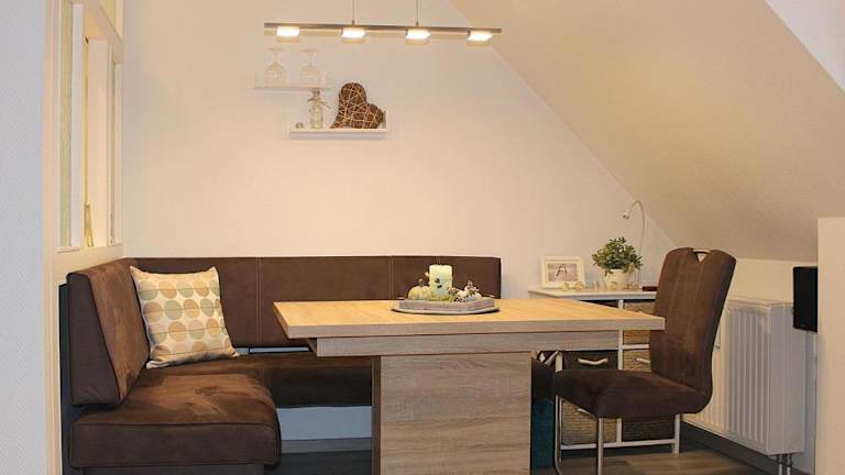 Die Ferienwohnung ist mit einer Küchenzeile ausgestattet, die einen Kühlschrank, einen Geschirrspüler, einen Ofen und eine Kaffeemaschine beinhaltet. Es werden keine Verpflegungsmöglichkeiten in der Unterkunft angeboten.