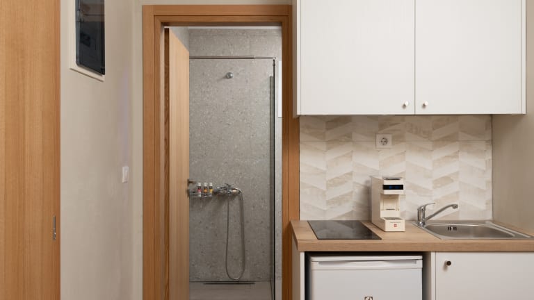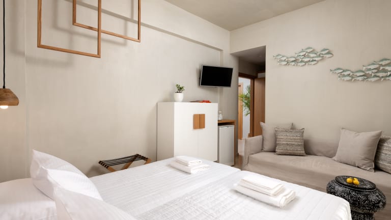 Doppelzimmer Deluxe renoviert Zum Sommer 2024 frisch renoviert und verfügen über Dusche/WC, Toilettenartikel, Föhn, individuelle Klimaanlage/Heizung (inklusive), Wi-Fi (inklusive), Telefon, Safe (inklusive), TV, Minikühlschrank, Deckenventilator, Kaffee-/Teezubereiter mit täglicher Auffüllung, Nespressomaschine (inklusive 2 Kapseln pro Tag, weitere gegen Gebühr),1 Flasche Wasser täglich und Balkon (DD2). Wahlweise auch zur Alleinnutzung buchbar (DD1/1TA). Verfügen bei gleicher Ausstattung wie die Doppelzimmer Deluxe zusätzlich über eine Kitchenette mit Kühlschrank, Kochplatte, Wasserkocher, Küchenausstattung und einen Esstisch (DX2/G2I). Ab Sommer 2024 ebenfalls frisch renoviert mit den gleichen Annehmlichkeiten wie die Doppelzimmer Deluxe. Wahlweise auch zur Alleinbenutzung buchbar (DX1).