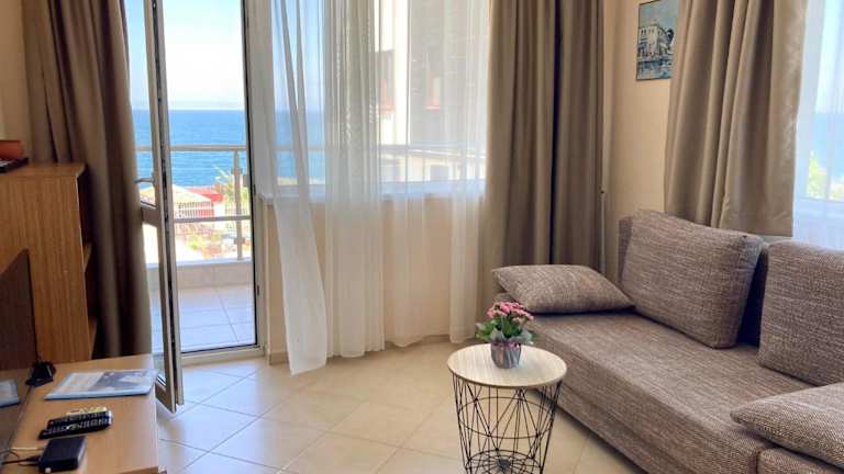 Die modernen Apartments sind mit einer gut ausgestatteten Küche, einem Essbereich und einem Sitzbereich mit Sofas sowie Kabel-TV ausgestattet. Jedes Apartment verfügt über einen Balkon mit Blick zum Meer, was eine heimelige Atmosphäre schafft.