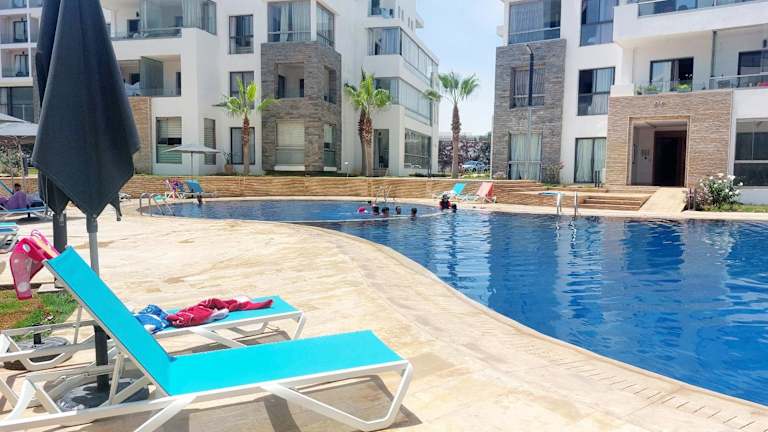 Appart Luxe Vacances Agadir B9 bietet Gartenblick von einem Balkon und verfügt über einen eigenen Pool. Die Unterkunft ist klimatisiert und mit kostenlosem Wifi sowie einer Privatparkierung ausgestattet.
