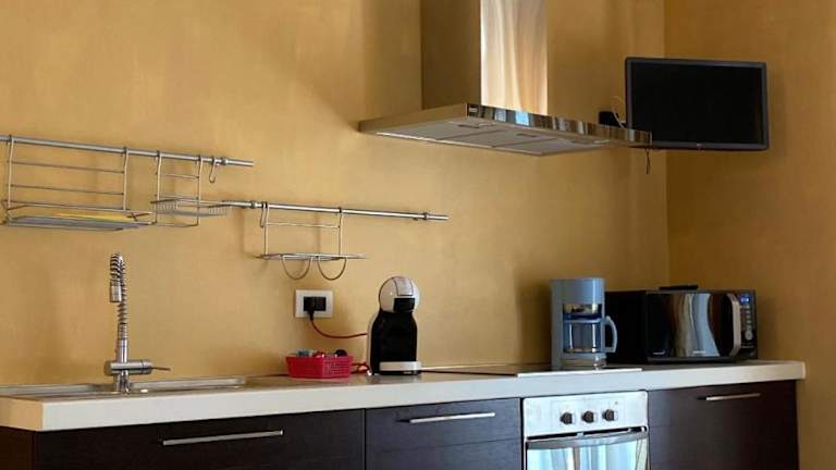 Die Unterkunft beinhaltet eine voll ausgestattete Küche mit Kühlschrank, Ofen, Mikrowelle und Herdplatte, die es den Gästen ermöglicht, sich selbst zu verpflegen. Zudem sind eine Kaffeemaschine und ein Wasserkocher vorhanden für die Zubereitung von Heissgetränken. Es gibt keine weiteren Informationen zur Verpflegung.