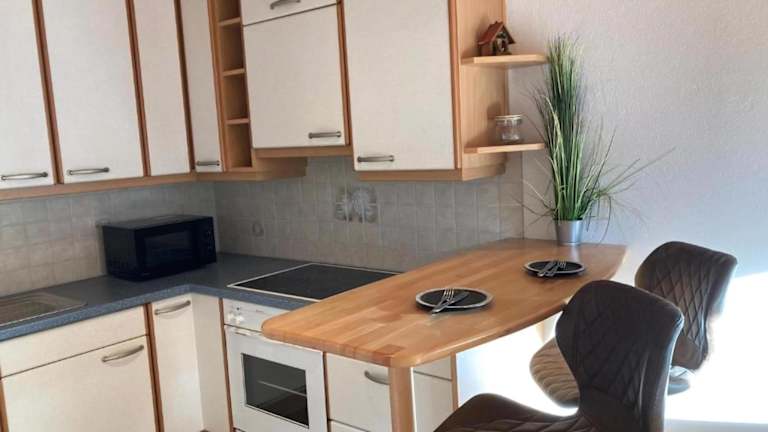 Die Ferienwohnung besteht aus einem Schlafzimmer, einem Wohnzimmer, einer voll ausgestatteten Küche mit Kühlschrank und Kaffeemaschine sowie einem Badezimmer mit Dusche und Haartrockner. Bettwäsche und Handtücher werden bereitgestellt.