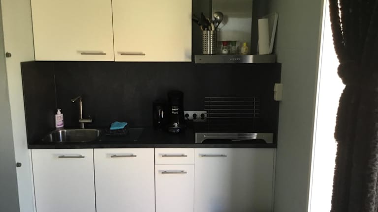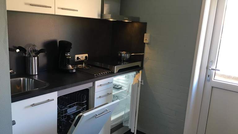 Die Küche der Ferienwohnung ist ausgestattet mit einem Kühlschrank, einem Geschirrspüler, einem Ofen, einer Kaffeemaschine und einem Wasserkocher. Es liegen keine spezifischen Informationen zu weiteren Verpflegungsmöglichkeiten vor.