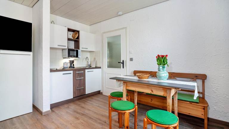 Die Ferienwohnung ist über eine Küche mit einem Kühlschrank, einer Mikrowelle, einer Herdplatte sowie einer Kaffeemaschine und einem Wasserkocher ausgestattet. Es sind keine Informationen zu Verpflegungsmöglichkeiten wie Frühstück oder Restaurant vorhanden.