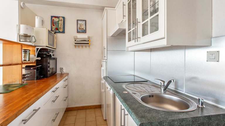 Die Ferienwohnung beinhaltet eine gut ausgestattete Küche mit Kühlschrank und Geschirrspüler, die eine Selbstversorgung ermöglicht. Zudem stehen Grillmöglichkeiten zur Verfügung.
