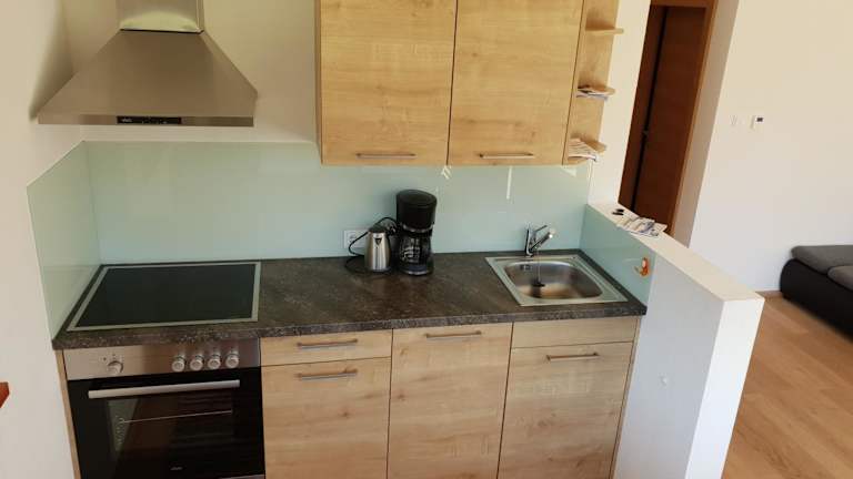 Die Ferienwohnung verfügt über eine voll ausgestattete Küche mit einem Kühlschrank und einer Kaffeemaschine, in der Gäste ihre eigenen Mahlzeiten zubereiten können. Zudem besteht die Möglichkeit, den Grill zu nutzen.