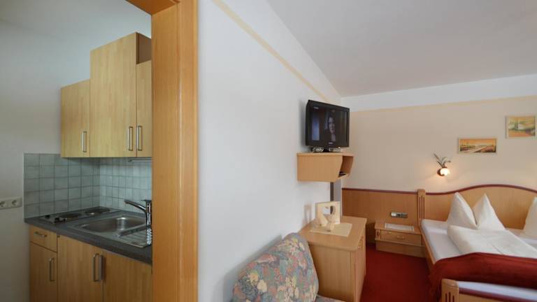 Das Appartement verfügt über einen Balkon mit Bergblick, einen heimeligen Sitzbereich, einen Satelliten Flachbild-TV und eine voll ausgestattete Küche mit Kühlschrank und Herdplatte. Ein eigenes Badezimmer mit Dusche und Bademänteln steht ebenfalls zur Verfügung.