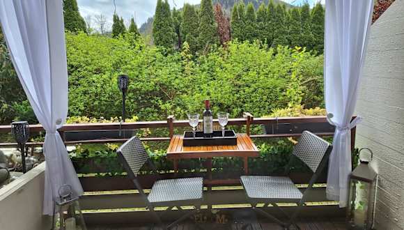 Die Ferienwohnung verfügt über ein Schlafzimmer, ein Badezimmer sowie eine voll ausgestattete Küche. Zur Einrichtung gehören Bettwäsche, Handtücher und ein Flachbild-TV mit Kabelkanälen. Zudem bietet die Unterkunft einen Essbereich und einen Balkon mit Blick auf die Berge.