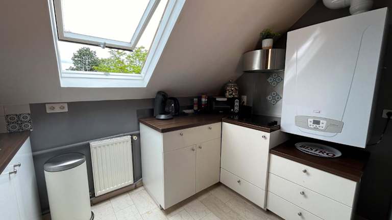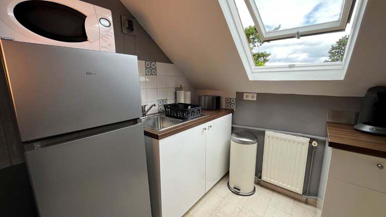 Die Wohnung ist ausgestattet mit einer Küche, die über einen Kühlschrank und einen Ofen verfügt. Sie beinhaltet zudem einen Sitzbereich sowie ein Badezimmer mit einer Badewanne.