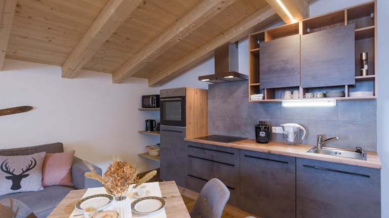Das Appartement Morgensonne verfügt über ein Schlafzimmer und zwei Badezimmer. Zur Ausstattung gehören Bettwäsche, Handtücher, ein Flachbild-TV mit Kabelkanälen, ein Essbereich sowie eine voll ausgestattete Küche. Die Terrasse bietet einen schönen Blick auf die Berge, was die Unterkunft besonders attraktiv macht.