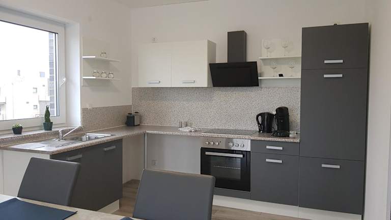 Die Wohneinheiten verfügen über eine voll ausgestattete Küche mit Kühlschrank, Ofen, Herdplatte, Toaster, Kaffeemaschine und Wasserkocher. Ein Essbereich ist ebenfalls vorhanden.