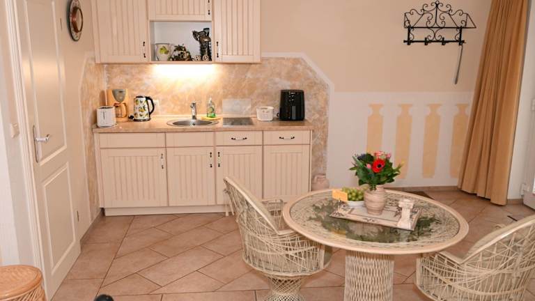 Die Küchenzeile der Ferienwohnung ist ausgestattet mit einem Kühlschrank, Geschirrspüler, Herdplatte, Kaffeemaschine und Wasserkocher, sodass die Gäste ihre Mahlzeiten bequem zubereiten können.