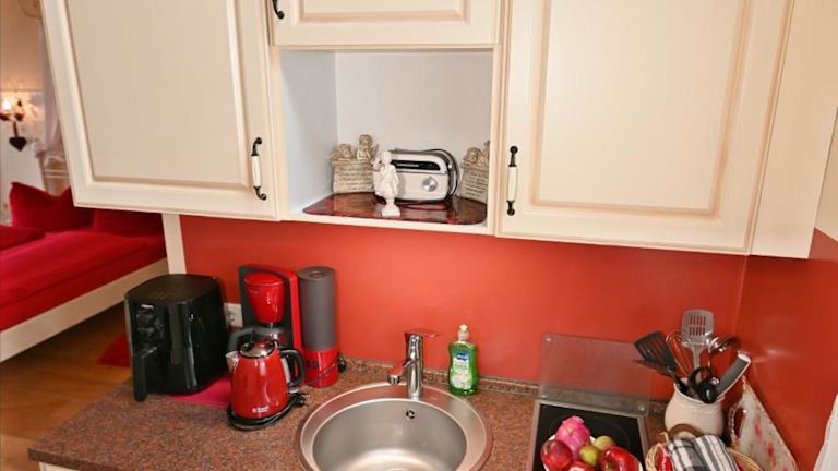 Die Küchenzeile ist ausgestattet mit einem Kühlschrank, einer Herdplatte, einem Toaster, einer Kaffeemaschine und einem Wasserkocher, sodass die Gäste selbstständig einfache Mahlzeiten zubereiten können.