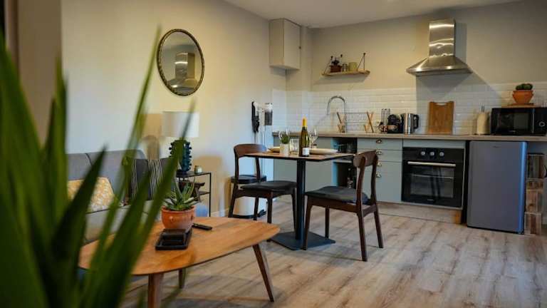Das Appartement verfügt über ein Schlafzimmer, eine Küche mit Kühlschrank und Ofen, ein Wohnzimmer mit Flachbild-TV und Sitzbereich sowie ein Badezimmer mit Dusche. Handtücher und Bettwäsche können gegen Aufpreis bereitgestellt werden. WLAN ist in der gesamten Unterkunft kostenlos verfügbar.