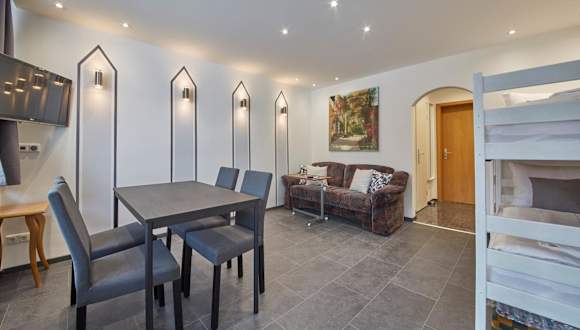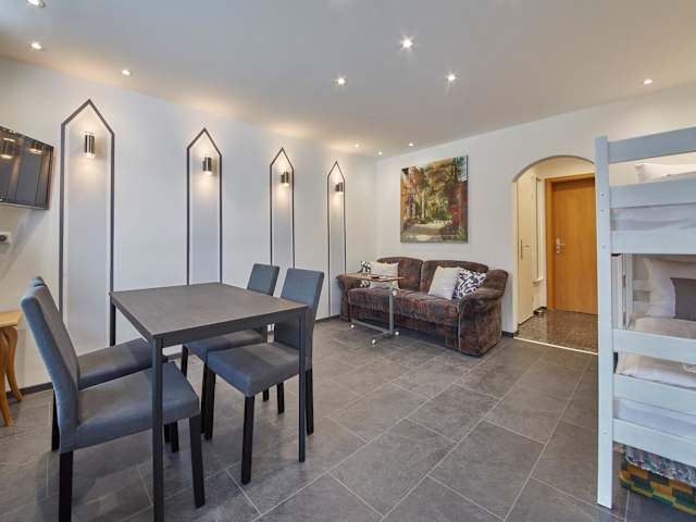 Die Ferienwohnung umfasst ein Schlafzimmer, Sitzplätze sowie einen Satelliten Flachbild-TV. Eine Küchenzeile mit Kühlschrank ist ebenfalls vorhanden. Handtücher und Bettwäsche werden bereitgestellt.