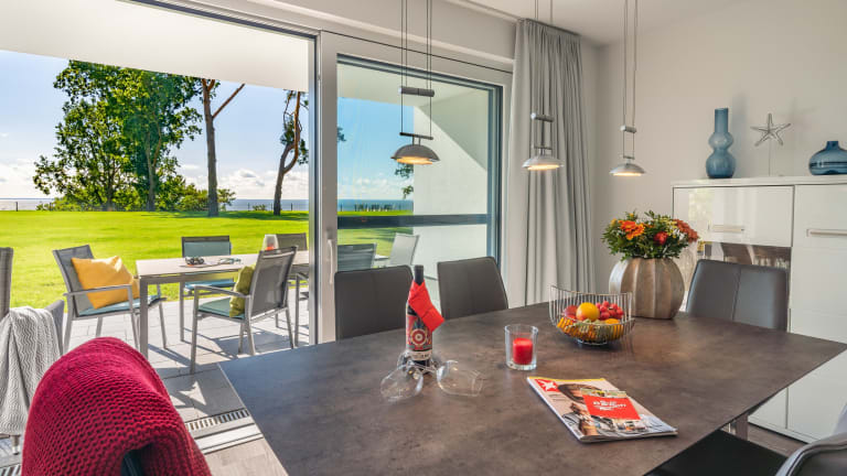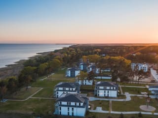 Die „Oase am Haff“ begrüßt Sie auf der Sonneninsel Usedom! Meer. Ruhe. Erleben. Wir freuen uns, dass Sie Ihre wertvollen Urlaubstage bei uns verbringen. Jede Wohnung unserer Luxus-Ferienwohnanlage bietet Ihnen auf großen Sonnenterrassen ein traumhaftes Panorama auf das Stettiner Haff. Der fantastische Blick auf das sonnenfunkelnde Wasser wird Sie verzaubern. Alle Terrassenwohnungen und Appartements sind anspruchsvoll und modern ausgestattet. Großzügige Rasenflächen mit angelegten Gehwegen umgeben unsere Ferienhäuser. Einzelne Terrassen laden mit Sitzgelegenheiten an der Steilküste zum Verweilen ein. Räume für gemeinsamen Zeitvertreib bei Wellness und Fitness stehen Ihnen kostenfrei zur Verfügung. Freuen Sie sich auf unsere Saunen und Infrarotkabinen. Gern können Sie sich auch für eine entspannende Massage anmelden. Auf Ihre Kinder warten mehrere Außenspielplätze mit Kletterturm, Spielgeräten, Seilbahn und Bolzplatz. Bei schlechtem Wetter finden Ihre Kinder ausreichend Spielemöglichkeiten im Innenspielraum. Sie können sich an unserer Boule-Bahn oder im Gemeinschaftsraum für Fitness und Tischtennis zusammenfinden. Im Souterrainbereich befindet sich ein Billardzimmer und ein Gemeinschaftsraum für Dart und Kicker sowie ein Clubraum zum geselligen Beisammensein mit der Möglichkeit zum Sports-Viewing und einer Bar. Fußläufig erreichen Sie das von uns geführte Restaurant „Der Rote Baron“ im Stil der Fliegerromantik. Es befindet sich an der spektakulären Flugzeug-Ausstellung „Hangar 10“ und am Natur-Flughafen Heringsdorf. Feines Essen und ausgewählte Getränke erwarten Sie dort. Tagsüber erhalten Sie im Bistro unseres Restaurants selbstgebackenen Kuchen, den Sie bei einer Tasse Kaffee auf den Restaurant-Terrassen genießen können. Unser Fahrradverleih hält klassische Tourenräder für Sie bereit (nach Verfügbarkeit und gegen Gebühr). Ihre Fahrräder können Sie auch gern mitbringen und in abschließbaren Fahrradräumen sicher unterbringen. Vor den Häusern gibt es mehrere Grillplätze zur freien Verfügung. Über die nicht weit von uns entfernten berühmten Kaiserbäder Bansin, Heringsdorf und Ahlbeck ist der einmalige Usedomer Ostseestrand mit dem Auto in maximal 15 Minuten zu erreichen. In etwa der Hälfte des Weges erreichen Sie den Golfplatz Korswandt. Hier erhalten Sie als unsere Gäste Vergünstigungen bei den Tickets. Ruhigere Strandabschnitte befinden sich in Swinemünde. Besonders empfehlen können wir Ihnen einen Besuch im urigen Fischerdorf Kamminke mit seinem Strand an der Haffküste. Das Open-Air-Restaurant am Hafen bietet eine frische Fischküche und einen Platz vor atemberaubenden Sonnenuntergängen.