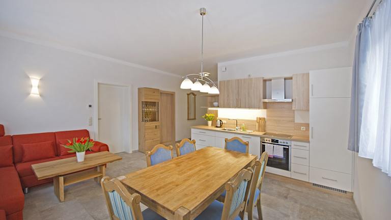 Die Wohneinheiten des Appartementhauses sind mit Parkettböden ausgestattet und verfügen über eine voll ausgestattete Küche, die einen Kühlschrank, Geschirrspüler, Ofen, Herdplatte und Wasserkocher einschliesst. Ein Essbereich und ein Flachbild-TV mit Kabelkanälen sind ebenfalls vorhanden. Jedes Appartement beinhaltet ein eigenes Badezimmer mit Dusche. Es sind Familienzimmer verfügbar.