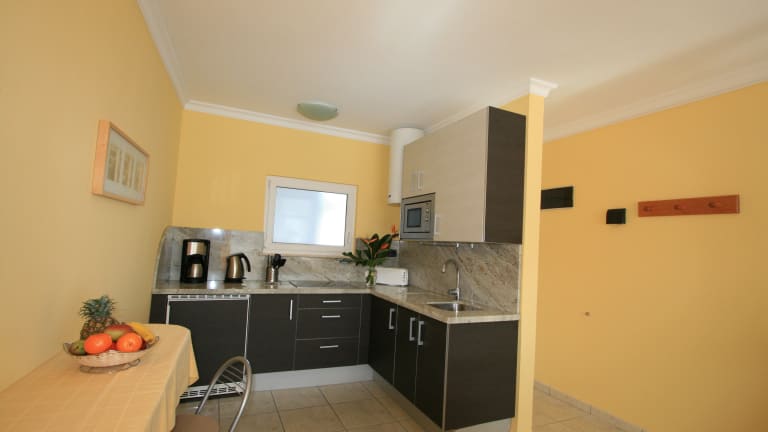 Die Apartements haben ein separates Schlafzimmer mit 2 zusammenstehenden 2 Meter großen Betten, sehr guten Matratzen und eingezogene Wäsche. Der Wohnraum mit angrenzender offener Küche ist freundlich tapeziert und möbliert. Großer SAT-TV mit allen Programmen ist vorhanden. Die Küche hat komplette Ausstattung u.a. Microwelle, Toaster, Kaffeemaschine, Wasserkocher, 4 Sterne Kühlschrank mit Gefrierfach usw. Das Bad hat zur besseren Lüftung ein Fenster, Dusche. Dem Wohnraum zur Südseite vorgelagert ist Balkon /Terrasse. Alle Wohnungen mit Balkon haben Meersicht. Suite: Gegenüber den Apartements noch bessere Ausstattung unter anderem rießengroßer Balkon oder Terrasse. Zugang zum Balkon/Terrasse nicht nur vom Wohnraum sondern auch vom Schlafraum aus. Im Schlafraum fefindet sich ein 2. SAT-TV. Der Fernseher im Wohnraum hat eine Größe von 102 cm. Wlan gratis.