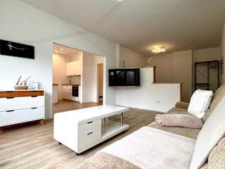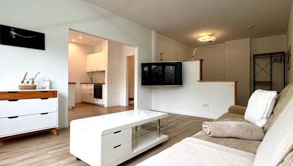 Die Ferienwohnung ist mit einem Satelliten Flachbild-TV und einem einladenden Wohnzimmer ausgestattet. Die Küche verfügt über einen Kühlschrank, Geschirrspüler, Ofen, Kaffeemaschine und Wasserkocher.