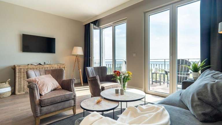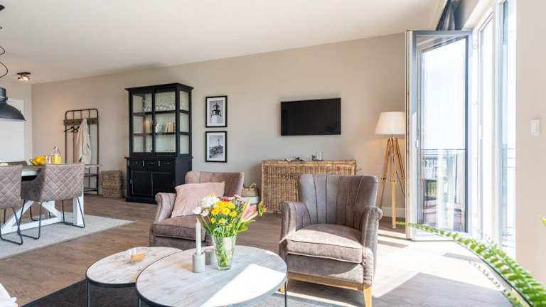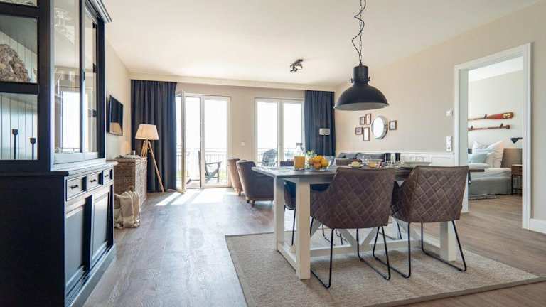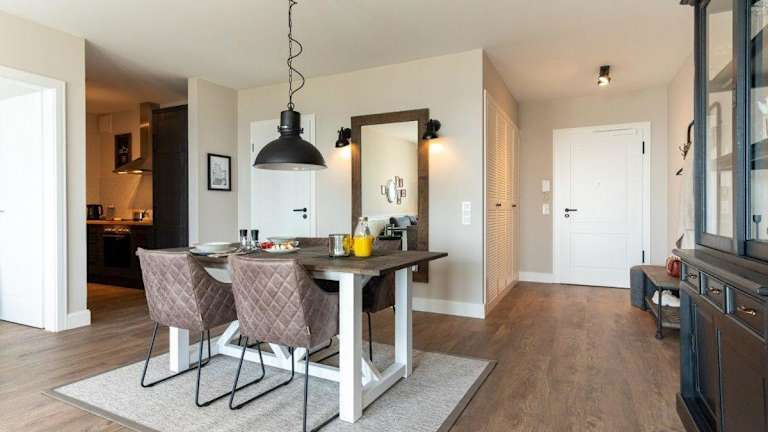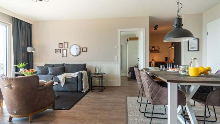Die Ferienwohnung umfasst einen Balkon, ein Schlafzimmer, ein Wohnzimmer sowie eine gut ausgestattete Küche, die mit einem Kühlschrank und einem Geschirrspüler eingerichtet ist. Handtücher und Bettwäsche werden bereitgestellt.