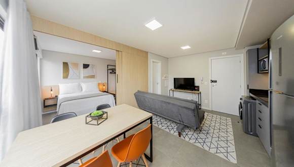 Die Ferienwohnung Apto 1 quarto moderno p/ 4 pessoas - WD3573 verfügt über ein Schlafzimmer, eine Klimaanlage, einen TV sowie eine Küche, die mit einem Kühlschrank und einer Mikrowelle ausgestattet ist. Die Unterkunft ist als Nichtraucherunterkunft deklariert und es sind keine Haustiere erlaubt.