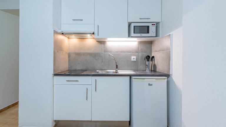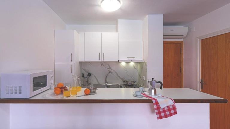 Jedes Apartment verfügt über eine kleine Terrasse sowie eine Essküche mit Mikrowelle, Kochfeld und Kaffeemaschine. Zur weiteren Ausstattung gehören ein Sitzbereich mit Sofa und TV sowie ein eigenes Badezimmer mit Badewanne. Die Apartments bieten Ausblicke auf den Pool, den Garten oder die Strassen.