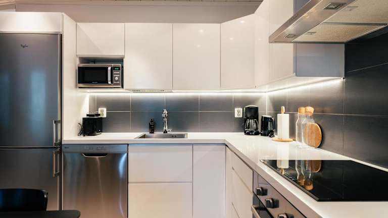 Die Unterkunft verfügt über eine voll ausgestattete Küche, die mit einem Kühlschrank, Geschirrspüler, Ofen, Mikrowelle, Herdplatte, Kaffeemaschine und Wasserkocher ausgestattet ist.