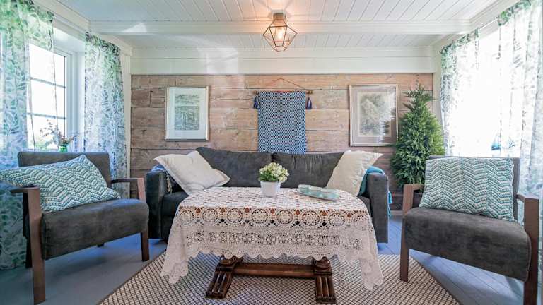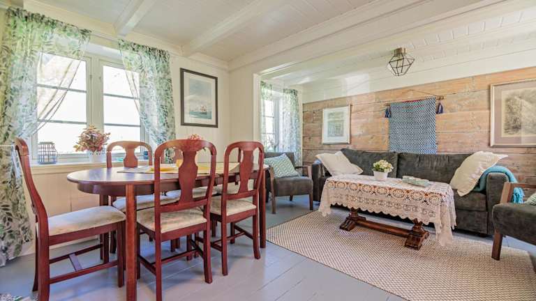 Das Ferienhaus bietet eine Terrasse mit Meerblick, ein Badezimmer mit Dusche und ist ideal für entspannende Ferien in der Natur.