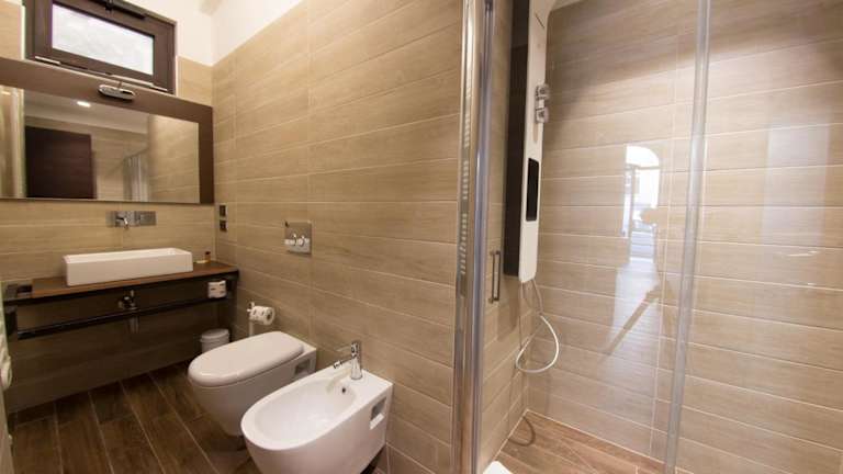 Die Zimmer der Arena Luxury Rooms sind mit einem eigenem Bad und kostenfreien Pflegeprodukten ausgestattet. Zudem verfügen sie über eine Kaffeemaschine, einen Wasserkocher und einen Flachbild-TV.