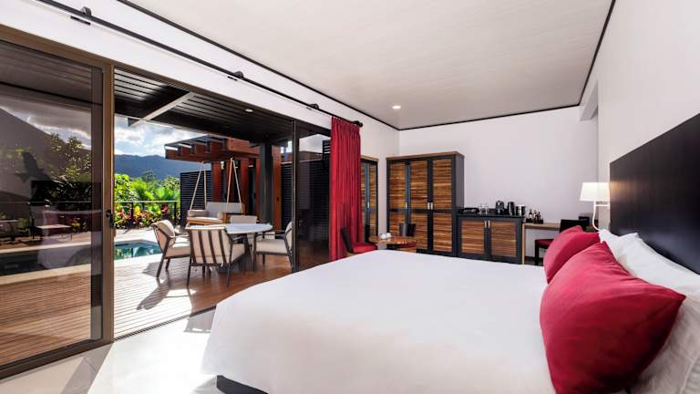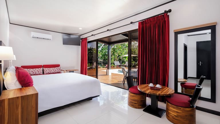 Die Zimmer sind modern und bieten eine Klimaanlage, einen Balkon, ein Doppelbett oder Optionsbett, einen Safe, eine Minibar sowie ein eigenes Bad mit kostenlosen Pflegeprodukten. Die meisten Zimmer bieten zudem eine Aussicht auf den Vulkan Arenal. Zusätzliche Annehmlichkeiten sind Gebühren Wifi, Sat-TV und ein Schreibtisch. Es gibt rollstuhlgerechte Zimmer und Nichtraucherzimmer.