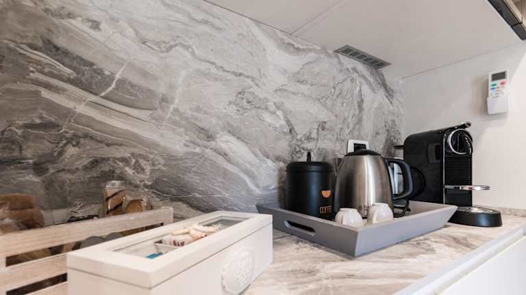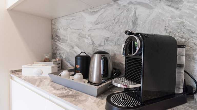 Eine voll ausgestattete Küche ist vorhanden, inklusive Kühlschrank und Kaffeemaschine. Essenslieferungen in die Unterkunft sind ebenfalls möglich.