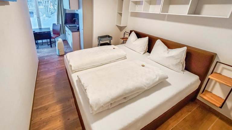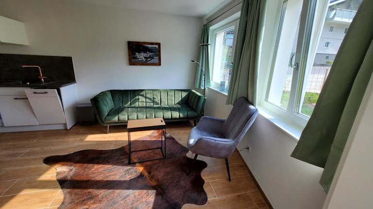 Die Unterkunft bietet Zimmer mit Bergblick, einem Sitzbereich und einem Satelliten-Flachbild-TV. Eine voll ausgestattete Küchenzeile mit Kühlschrank, Geschirrspüler, Mikrowelle, Herdplatte, Toaster, Kaffeemaschine und Wasserkocher steht zur Verfügung. Zudem verfügen die Zimmer über ein eigenes Badezimmer mit Dusche und Haartrockner.
