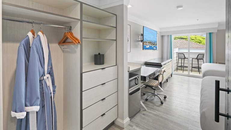 Die klimatisierten Zimmer sind komfortabel eingerichtet und verfügen über einen Balkon oder eine Terrasse mit Meerblick. Zur Ausstattung zählen ein Kühlschrank, eine Mikrowelle, eine Tee- und Kaffeezubereitungsmöglichkeit, ein TV-Gerät sowie kostenloses Wifi. In den Badezimmern sind Kosmetikartikel und ein Haartrockner vorhanden. Es gibt auch rollstuhlgerechte Zimmer mit barrierefreien Badezimmern.