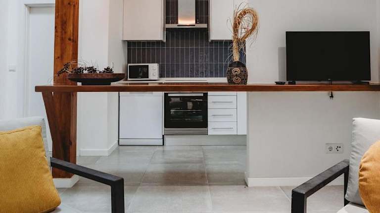 Die Ferienwohnung verfügt über eine voll ausgestattete Küche mit einem Kühlschrank und einem Wasserkocher, sodass die Gäste die Möglichkeit haben, ihre eigenen Mahlzeiten zuzubereiten.