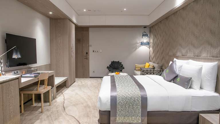 Die Zimmer sind elegant und geräumig, ausgestattet mit Klimaanlage, einem Safe, einem Kühlschrank und einem Flachbildfernseher. Zudem gibt es einen Wasserkocher, Hausschuhe sowie ein eigenes Badezimmer mit Dusche, Badewanne und Haartrockner. Die Einrichtung umfasst auch rollstuhlgerechte Zimmer sowie Familien- und Nichtraucherzimmer.