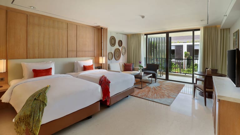 Die Zimmer im Hotel Aryaduta Bali sind komfortabel und stilvoll eingerichtet. Sie verfügen über eine Klimaanlage, einen Balkon oder eine Terrasse und eine Minibar. Ein Flachbildfernseher und kostenfreies WLAN sind ebenfalls vorhanden. Die Badezimmer sind mit einer Dusche oder einer Badewanne, einem Haartrockner und Bademänteln ausgestattet.