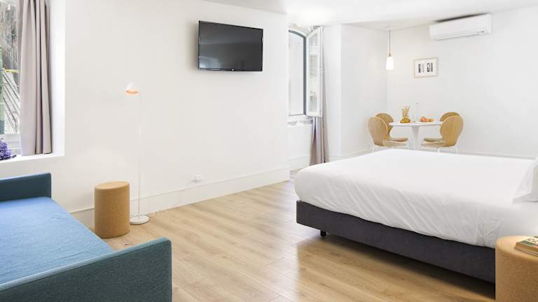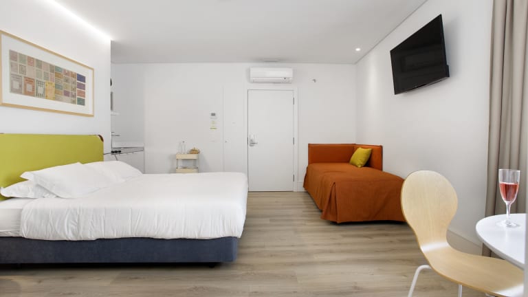 Die eleganten Studios sind hell und modern eingerichtet und bieten eine Küchenzeile sowie ein Badezimmer mit Dusche und kostenfreien Pflegeprodukten. Jedes Studio ist mit einem Sitzbereich und einem Flachbild-Kabel-TV ausgestattet. Zur Ausstattung gehören zudem ein Kühlschrank, eine Mikrowelle, ein Toaster und eine Kaffeemaschine. Ein Safe sorgt für die Sicherheit der Wertsachen der Gäste. Das Haus bietet sowohl Familien- als auch Nichtraucherzimmer.