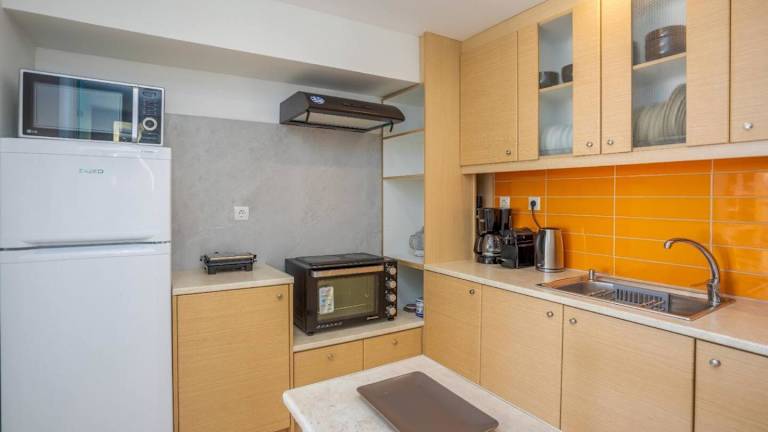 Die Küche in der Unterkunft Ascuri Studio ist funktional eingerichtet und umfasst einen Kühlschrank, einen Ofen, eine Mikrowelle, eine Kaffeemaschine sowie einen Wasserkocher.