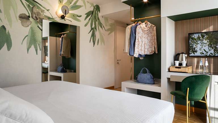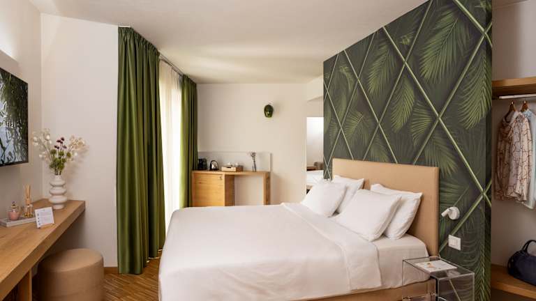 Die Zimmer sind modern gestaltet und bieten kostenfreies WLAN sowie Sat-TV. Sie sind in mehreren Gebäuden rund um den Garten verteilt und verfügen über Parkettböden. Zur Ausstattung gehören ein Bademantel, Hausschuhe, Föhn sowie ein Safe ohne Gebühr. Doppelzimmer sind in verschiedenen Typen verfügbar und bieten Platz für 2 bis 3 Personen. Jedes Zimmer ist mit Klimaanlage, Heizung, Telefon und einem Badezimmer mit Dusche oder Badewanne ausgestattet.