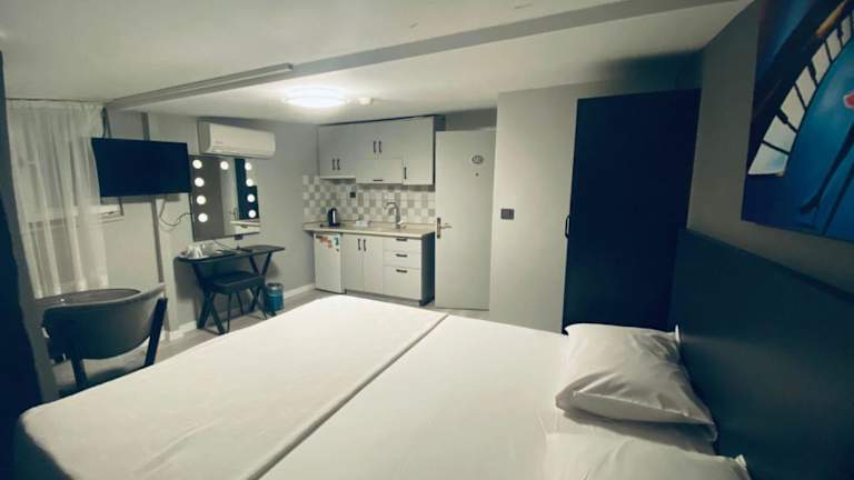 ATABAY SUiT OTEL bietet Übernachtungsmöglichkeiten mit Klimaanlage und kostenlosem Wifi. Die Unterkunft umfasst Selbstversorger-Einheiten mit Parkettböden, die mit einem Satelliten Flachbild-TV, einem Safe und einer Küche mit Kühlschrank ausgestattet sind. Die Badezimmer verfügen über eine Dusche oder eine Badewanne mit kostenlosen Pflegeprodukten.