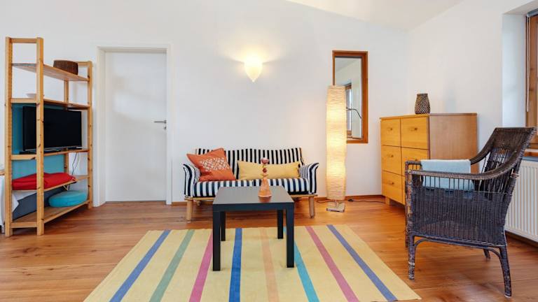 Die Ferienwohnung besteht aus einem Schlafzimmer, einem Wohnzimmer und einer voll ausgestatteten Küche mit Kühlschrank und Kaffeemaschine. Ein Badezimmer mit Dusche und kostenlosen Pflegeprodukten ist ebenfalls vorhanden. Handtücher und Bettwäsche werden bereitgestellt.