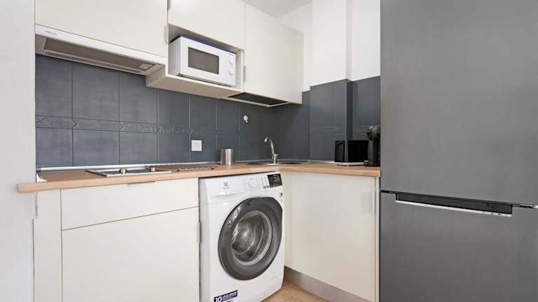 Die Ferienwohnung ist mit einer voll ausgestatteten Küche versehen, die einen Kühlschrank und eine Kaffeemaschine beinhaltet. Es werden keine spezifischen Verpflegungsmöglichkeiten erwähnt.