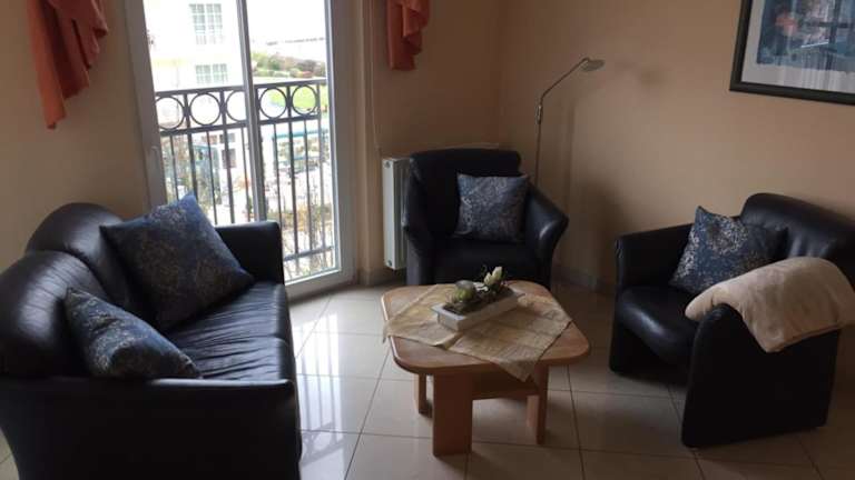 Die Ferienwohnung verfügt über einen Balkon mit Meerblick, 2 Schlafzimmer, ein Wohnzimmer, einen Flachbild-TV sowie eine gut ausgestattete Küchenzeile mit Kühlschrank und Geschirrspüler. Ein Badezimmer mit Dusche ist ebenfalls vorhanden. Handtücher und Bettwäsche können gegen eine Gebühr von 25.0 Euro pro Person ausgeliehen werden oder können selber mitgebracht werden.