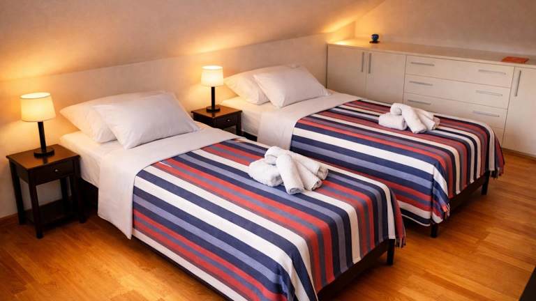 Die Ferienwohnung verfügt über 2 Schlafzimmer, 2 Badezimmer mit Dusche und Bidet, eine voll ausgestattete Küche mit Kühlschrank, Ofen und Mikrowelle sowie ein gemütliches Wohnzimmer mit Sitzbereich und Essbereich. Zur Ausstattung gehören auch eine Spielekonsole, ein Flachbild-TV mit Satellitenkanälen, ein DVD-Player und ein CD-Player. Zudem besteht die Möglichkeit, eigene Bettwäsche und Handtücher mitzubringen oder diese vor Ort auszuleihen.